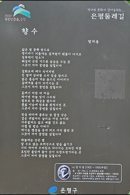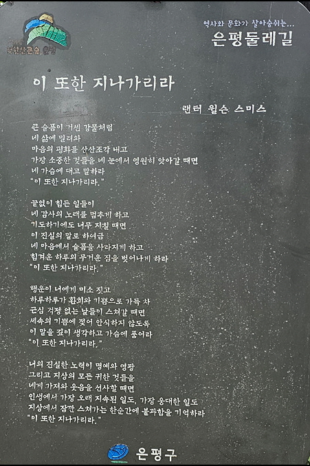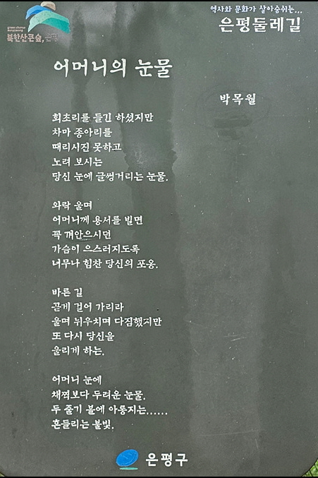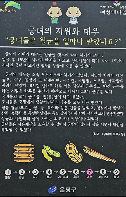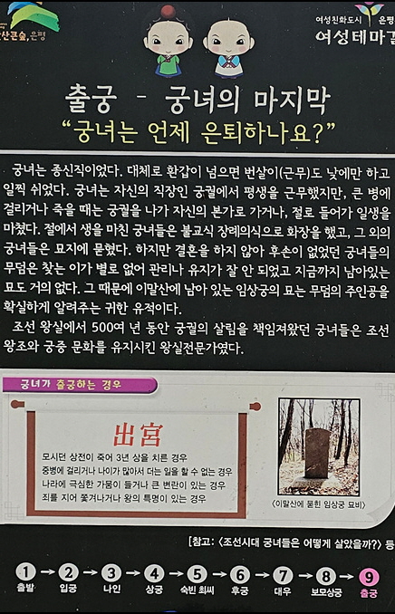 서울시 은평구 진관근린공원의 이말산은 사대부 묘를 비롯해 중인, 내시, 궁녀 등 다양한 계층의 무덤이 있어 조선시대의 공동묘지라 한다. 이곳에 은평둘레길 3코스가 조성되어 있다. 아래 사진은 등산로에 설치된 보드판 시문(詩文) 9편과 조선시대 궁녀의 역할을 설명한 보드판 10개의 내용이다.