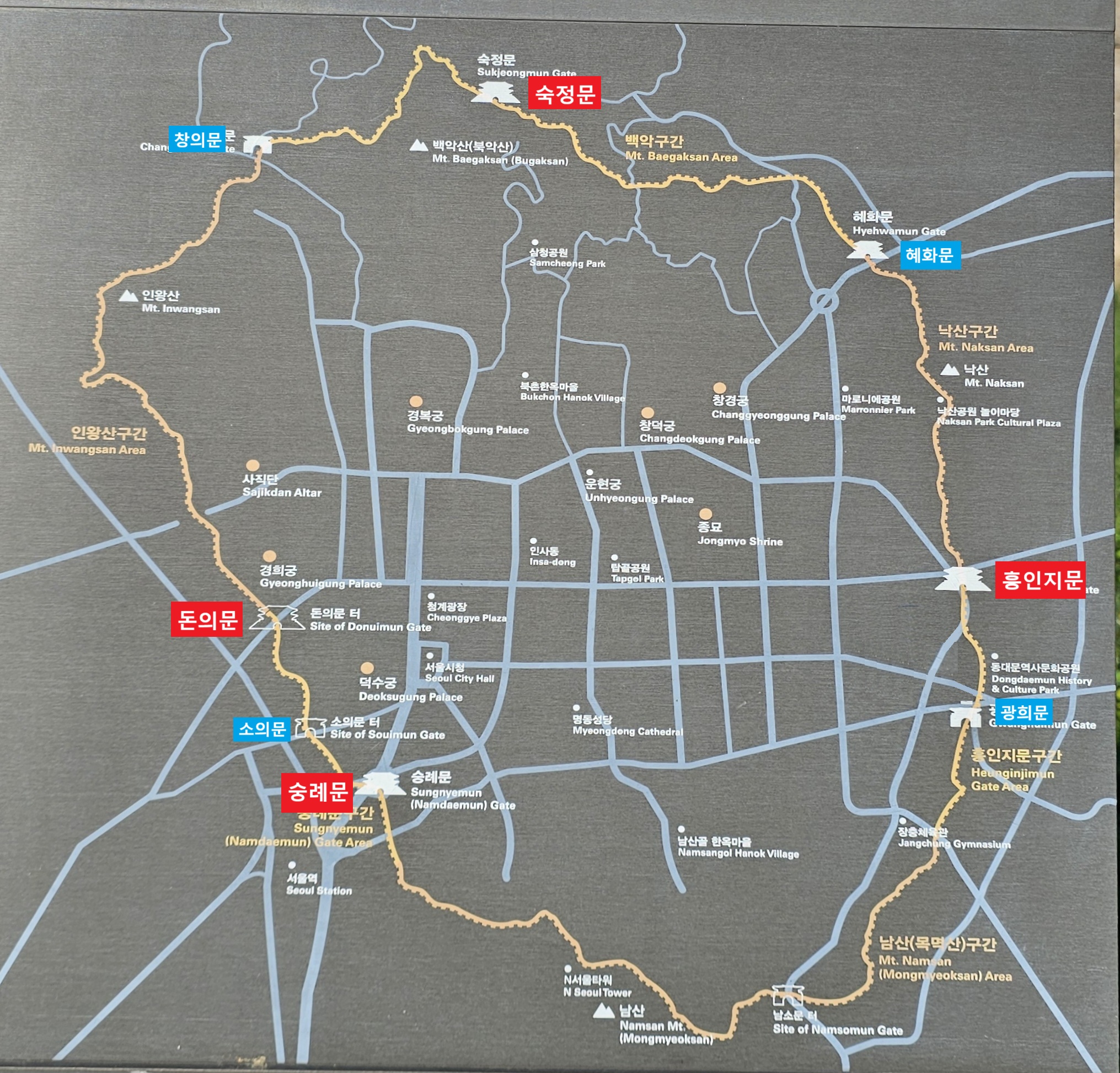 경성(京城)의 8문에서 정남쪽에 있는 문을 숭례문(崇禮門), 속칭 남대문이라 하였고, 정북쪽에 있는 문을 숙청문(肅淸門)이라 하였으며, 정동쪽에 있는 문을 흥인문(興仁門), 속칭 동대문이라 하였고, 정서쪽에 있는 문을 돈의문(敦義門), 속칭 신문(新門)이라 하였으며, 그 동북쪽에 있는 문을 혜화문(惠化門), 속칭 동소문이라 하였고, 서북쪽에 있는 문을 창의문(彰義門)이라 하였으며, 동남쪽에 있는 문을 광희문(光煕門), 속칭 남소문이라 하였고, 서남쪽에 있는 문을 소의문(昭義門), 속칭 서소문이라 하였다. 그리고 또 수구문(水口門)이 있었으니, 소의문과 수구문 이 두 문은 시체를 내보내는 데에 쓰였다.