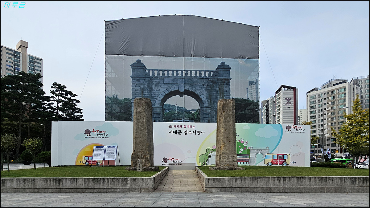 보수공사 중인 독립문과 그 잎의 영은문 주초