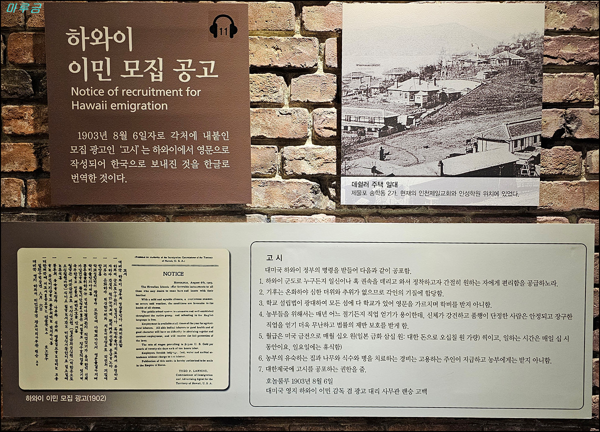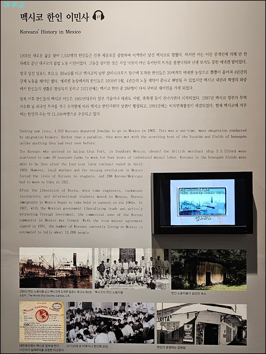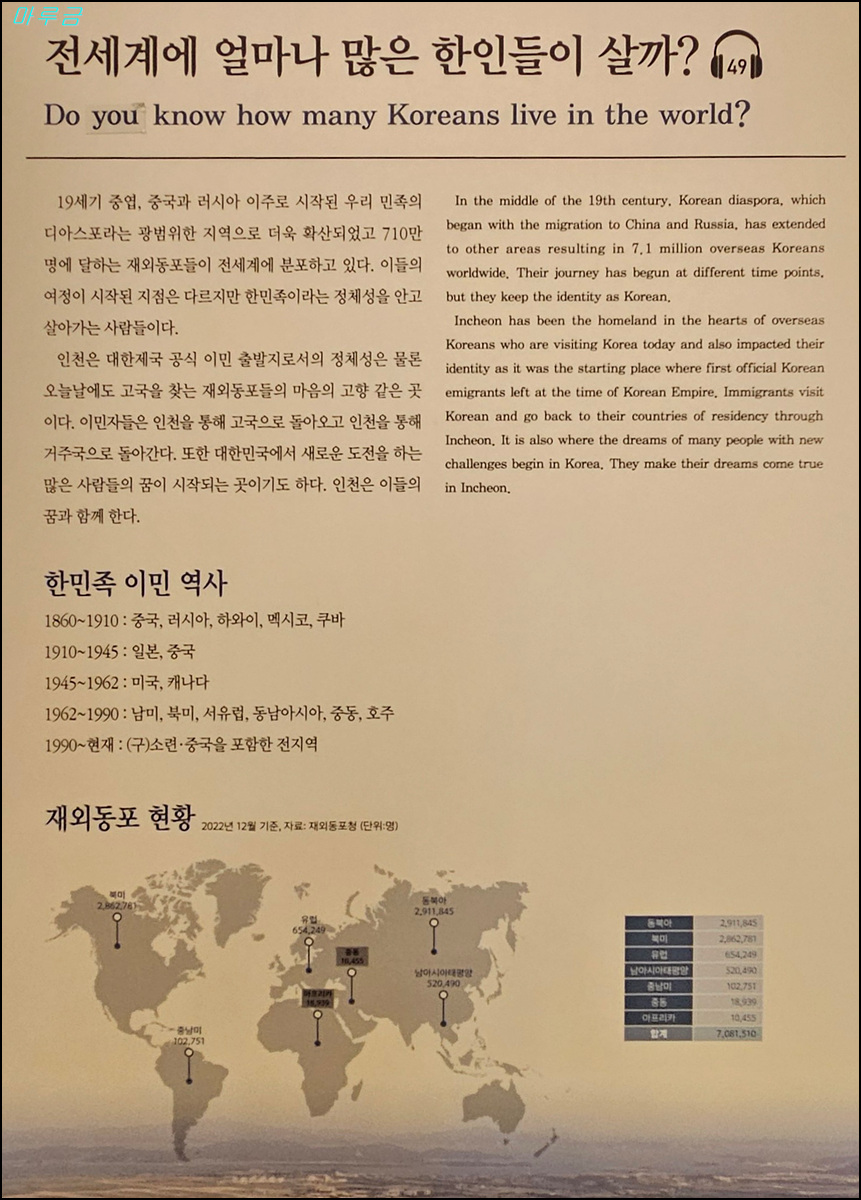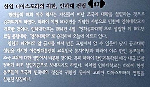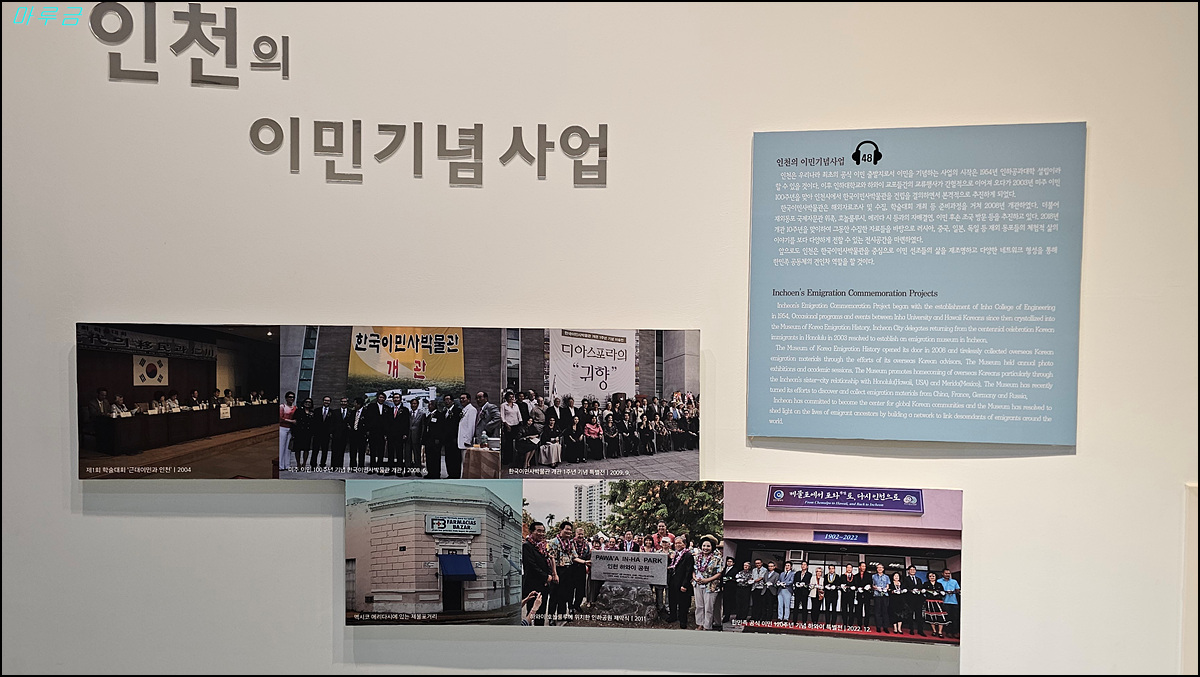 한국이민사박물관은 인천광역시의 명소인 월미도공원에 위치해 있다. 2003년 미주 이민 100주년을 맞아 우리 선조들이 해외에서의 개척자적인 삶을 기리고, 그 발자취를 후손들에게 전하기 위해 인천 시민들과 해외 동포들이 뜻을 모아서 건립한 우리나라 최초의 이민사박물관이다.