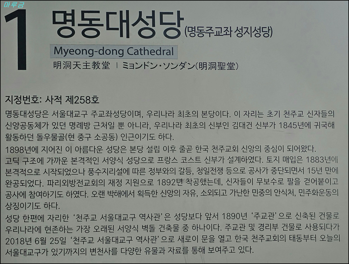 명동성당은 한국 천주교의 총본산이다. 1892년 착공, 1898년 완공되었다. 사적 제258호로 지정되어 문화적 가치를 인정받고 있으며, 종현성당, 명동천주교당이라고도 한다. 명동성당이 세워진 자리는 원래 역관 김범우의 집이 있던 자리로 이승훈, 정약전의 3형제, 권일신 형제 등이 모여 조선 천주교회를 탄생시킨 곳이다. 1866년 병인박해 때 순교자들의 유해를 지하 묘지에 안장했으며, 1945년 종현성당에서 명동대성당으로 명칭을 변경했다.