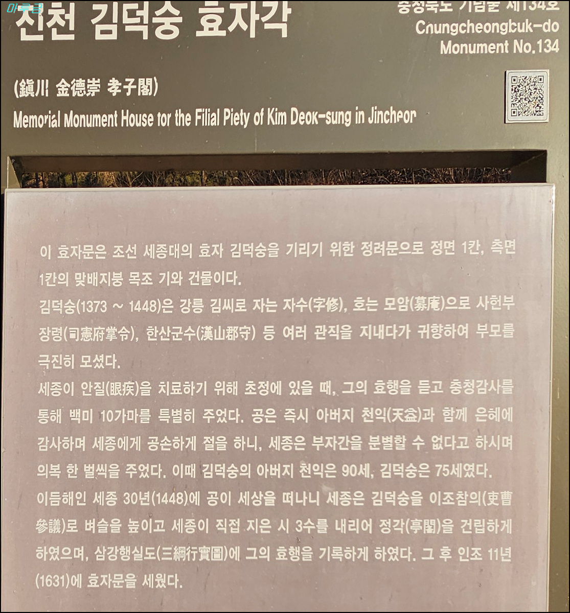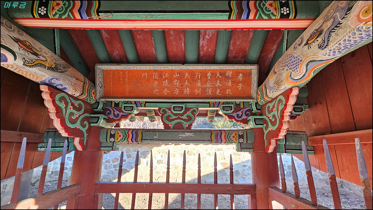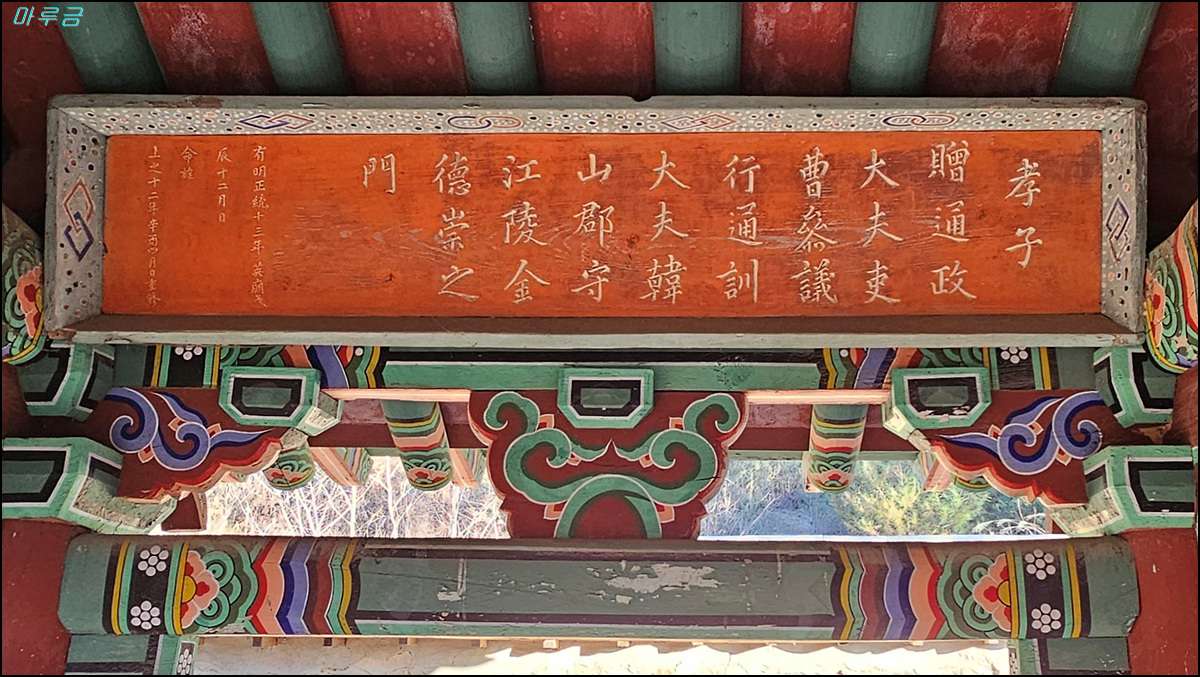 ▼ 정려문에 현판에 효자증통정대부이조참의행통훈대부한산군수강릉김덕숭지문( 孝子贈通政大夫吏曹參議行通訓大夫韓山郡守江陵金德崇之門)이라 적혀있다. 현판의 날짜는 유명정통 13년(1448년 / 세종 30년), 진십이월일(음력 12월)