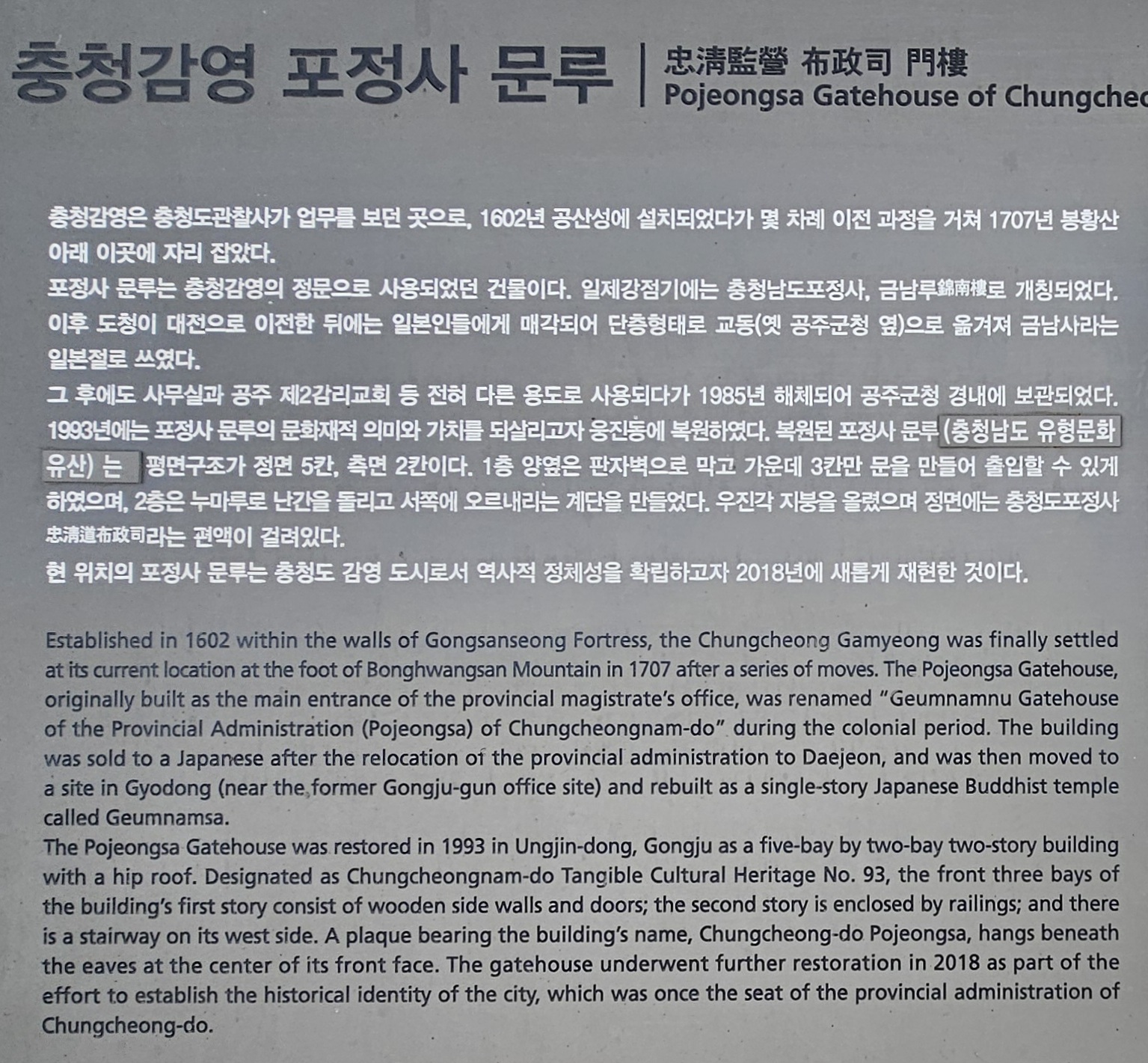 충남 공주시가지를 둘러싸고 있는 공주대간 산행을 마치고 나서, 시내 거리를 통과해 가던 도중에 '충청감영 포정사 문루'와 '공주 감영의 금영측우기', 공주 반죽동 당간지주' 등을 돌아보게 되었다. (포정사 : 조선 시대에 감사가 집무하던 관청)