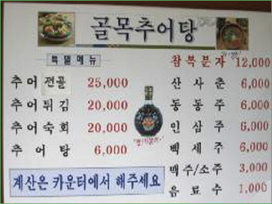 금산군 추부면 마전리에 추어탕 마을이 있다. 2009년에 음식특화의 거리로 지정된 곳인데, 대둔산 등반을 마치고 빠져나오면서 들렀다. 20년 전부터 추어탕을 팔고 있는 음식점을 비롯해 많은 추어탕 전문집이 있지만 그중에서 "골목추어탕" 집을 골라서 들어갔다.