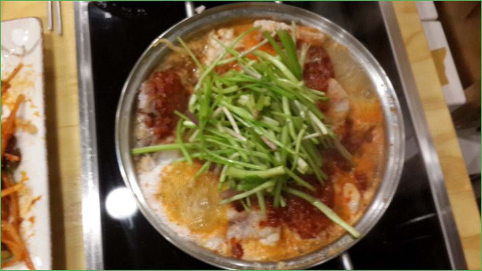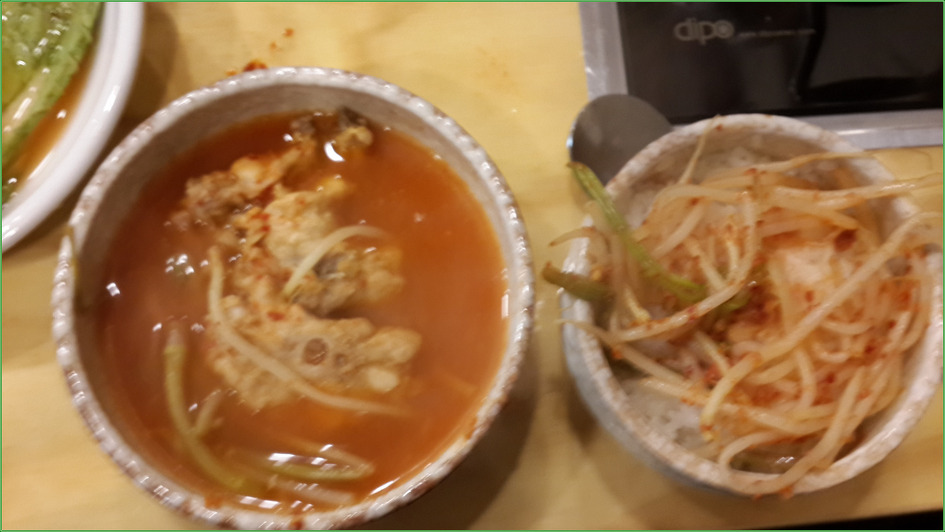 ▼ 매운탕을 끓이면서 콩나물이 완전히 익기 전에 건져내어 위 사진의 소스를 섞어 비빈다. 살짝 설익은 아삭아삭한 콩나물에서 신맛이 살짝 감도는 느낌이 상큼하다. 콩나물이 익을 때쯤이면 도우미가 와서 서빙을 해준다.